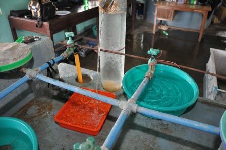The flow through hatchery consists of a metallic stand or cemented platform on which the small plastic tubs of 35cm dia with 9cm depth are placed in a row. The tub usually accommodates within 1000 eggs for better hatching. Water supply is provided from an overhead tank through a common pipe to all the tubs with individual control taps. Each tub is having provision of an outlet just bellow the rim of the tub. Feeble water supply or continuous water drops (200-250 ml/min) is provided to the incubation tub through control tap for optimum hatching of the eggs.